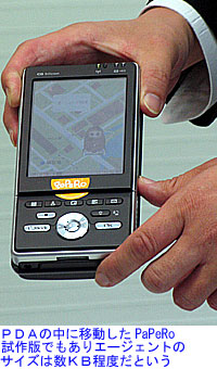最大の特徴は、PaPeRoを動かすシナリオプログラムが、実機を離れてパソコンやPDAなどに転送できること。これにより、家の中でレストランの情報をPaPeRoに探させ、今度はPaPeRoをカーナビに転送して現地までの案内をさせ、最後にPaPeRoをPDAに移して店内に持ち込み、おすすめ料理などの情報をさらに検索させるといった使い方が可能になる。
