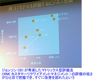 例えば、横軸に「コスト分析」、縦軸に「競争力分析」をとり、IT技術分野ごとに自社の実力がどこに位置するかを2×2の領域内にプロットしていく(写真参照)。「実際に、顧客要求管理のアプリケーションがコスト・競争力の両面で低位置にあることがひと目でわかり、IT投資の優先順位を変更して直ちに改善を図ることができた例がある」とジョンソンCIO。