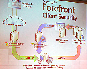 同社では、来年にはオフィスコミュニケーションサーバーも対象にする予定。また、クライアントソリューションも「フォアフロント・クライアントセキュリティ」の名称で投入する。こちらは12月13日から日本語ベータ版を配布することが決まっている。セキュリティポリシーをクライアント向けに展開することが容易になり、わかりやすい管理者向けのレポートツールなども用意される。