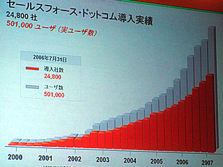同社では、サービスのプラットホームをオープンにすることで、世界中の開発者や独立系ベンダーが自分たちのサービスを自由に提供できる「AppExchange」を推進。今年から開始したが、すでに300種類を超えるアプリケーション(日本語版は48種類)が登録されており、1万2,500以上のインストール実績があるという。また、オープンな開発環境を利用してユーザー自身が作成したアプリケーションも4万3,000種類が利用されている。