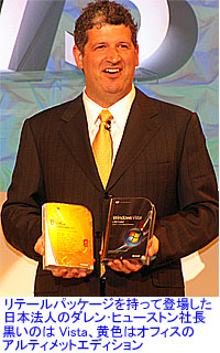 2007.01.16−マイクロソフトは15日、WindowsVistaおよび2007オフィスの30日の一般発売に向けた各種キャンペーン展開、さらに国内パソコン関連業界との連携に基づき、対応製品群がいっせいに出そろったことを発表した。日本法人のダレン・ヒューストン社長は、「すでに企業向け出荷は開始されていて、自分自身も毎日使用しているが、家に帰っても楽しすぎてパソコンの前から離れられないほど」と述べ、過去で最も成功した発売になると自信を示した。今回の発表イベントには、国内メーカーの各社幹部も勢ぞろいしたが、Vista発売はパソコン業界として久しぶりのビッグイベントとあって、業界を挙げて盛り上げていこうとの強い意気込みを感じさせた。