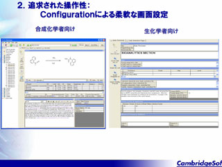 カスタマイズではなく、コンフィギュレーションでさまざまな用途に対応できるのがE-Notebookの特徴。合成化学者に合わせて、また生化学者の業務に合わせて画面を最適に設定することができる。グラクソ・スミスクラインなどは12種類のコンフィギュレーションを用意しているということだ。