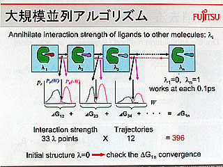 3番目のサービスは、大規模並列アルゴリズムを組み込んだ高精度結合エネルギー計算プログラム「MP-CAFEE」を利用する。富士通研究所が独自開発したもので、これも社内使用だけで商品化はされていない。たん白質とリガンドの結合・解離のプロセスにおける自由エネルギー変化を、多数の独立した分子動力学法(MD)シミュレーションに分割して計算し、この結果からAR法と呼ばれる統計的手法を用いて結合自由エネルギーを高精度に求める。力場としては、たん白質にはAMBER99、リガンドにはGAFF(最近ではたん白質にもGAFFを適用するケースを検証中)を採用している。