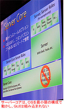 基調講演では、米本社のウィンドウズサーバー部門ゼネラルマネジャーのビル・レイン氏がロングホーンの特徴を概説した。とくに、システムの基盤部分の強化として“サーバーコア”が実現したことが注目される。これは、OSとしての最小構成でのインストールが可能になることで、「例えば、ファイルサーバーとして使用する場合にはGUIは必要ない。OSのコアとファイルサーバー機能だけが動いていればいい」とレイン氏。「不必要なセキュリティホールを設けないため、管理もしやすくなる」と説明する。