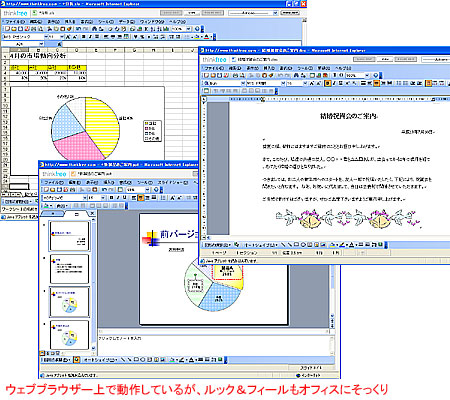 サービスの名称は、「ThinkFreeてがるオフィス」。AjaxとXML技術を利用することで、ウェブブラウザー上でオフィスソフトの機能を実現することを可能にした。開発したのは、2003年に韓国ハーンソフトに買収された米シンクフリーで、米国では2005年6月からサービス開始しているが、現在27万5,000人のユーザーがおり、約77万のドキュメントがオンライン上に保存されているという。