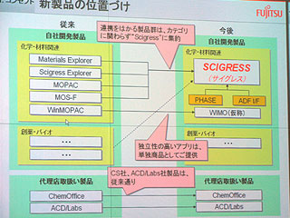 新プラットホーム「SCIGRESS」はこれらの統合製品の総称であり、ここに文科省プロジェクト「RSS21」で開発された「PHASE」の商用版(富士通が独自で強化していく意向を表明)と、菱化システムが国内販売権を持つ蘭サイエンティフィックコンピューティング&モデリングの密度汎関数法ソフト「ADF」(インターフェースを富士通が開発し、菱化システムはエンジンのみ提供)も組み入れる。動作環境は、Windowsデスクトップのほか、Linux(レッドハットおよびSUSE)に対応させる。