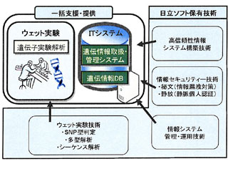 2007.10.30−日立ソフトは、遺伝子実験・検査・解析から情報システムの構築、さらに遺伝子情報の管理・運用までを一貫して提供する「遺伝子検査/解析支援サービス」を実用化し、本格的に提供開始した。遺伝子検査を事業の中に組み込むビジネス市場を主な対象としたい考えで、生活習慣病関連の遺伝子検査などの美容・健康アドバイザー、食の安全・安心を目指す食品対象遺伝子検査企業などにサービスを売り込む。3年後にライフサイエンス事業全体で20億円の売り上げを目指す。