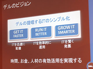 デル会長は、ソフト、ハード、システムインテグレーションが異なるベンダーから別々に提供されていることに加え、ソフトウエアを利用するアーキテクチャーもそれぞれに異なっていることがITの複雑化を増大させており、ITへの投資がメンテナンスに奪われていることの大きな原因だと指摘。それを踏まえたうえで、“ITのシンプル化”は、ITインフラの標準化・統合化・自動化を推進することで、システムを迅速に配備し、低コストで効率的に運用し、インテリジェンスに発展させることを可能にする。