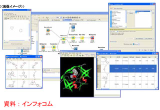 2008.02.05−インフォコムは1月31日、フリーのワークフローツール「KNIME」(ナイム)上で、ケムアクソン社のケムインフォマティクスツールを利用できるようにする「JChemエクステンション」を独自に開発し、全世界の創薬研究者向けに販売開始すると正式に発表した。化学構造を含むデータベース(DB)処理や化合物の物性計算など、一連の作業手順をワークフロー化して、自動的に実行させることが可能。プラットホームとなるKNIME自体は無償だが、ケムアクソンのライセンスが別途必要になる。