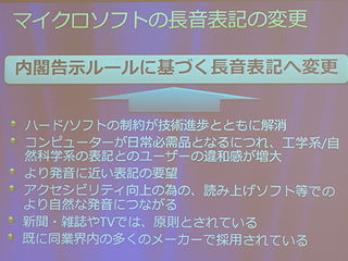 2008.07.29−マイクロソフトは25日、外来語カタカナ表記の末尾の長音表記を変更すると発表した。「コンピュータ」や「プリンタ」など、いわゆる理工系的な表記だったものを、「コンピューター」や「プリンター」のように長音を表記したものに改める。すべての製品・サービスのそれぞれ次期バージョンからこのルールを採用し、関連するマニュアルやヘルプ、ウェブドキュメントなどのすべての表記を変更する。ただし、現在および過去のドキュメントにまでは手をつけない。同社では、自然な表記・自然な発音に基づく変更として、ユーザーのメリットになると説明している。