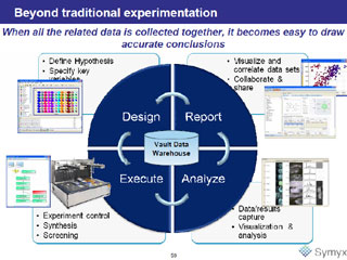 さらに昨年10月、旧MDLの買収を通じてソフトウエア事業を拡大。現在では、Symyxソフトウエア事業が約1億ドル、Symyxツールズ事業が約5,000万ドル、Symyxリサーチ事業が約2,500万ドルという売上構成となっている。
