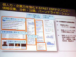 両社では、企業内の情報検索においても、戦略的な情報活用を志向する方向性が強まる中で、FAST ESPへのニーズが拡大するとみており、まさにふさわしいタイミングで買収が行われたと位置づけている。当面は、別々の製品として販売・サポートされるが、シェアポイントサーバーの次期バージョンではFAST ESPのエンジンを組み込んだソリューションも用意される予定である。(ただし製品統合というレベルではない)