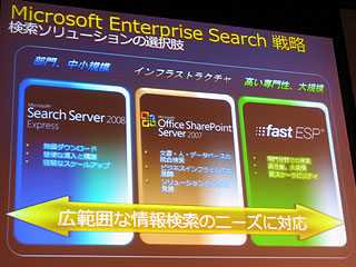 マイクロソフトの企業向け検索ソリューションは、「Microsoft Office SharePointServer 2007」(シェアポイントサーバー)が中心となる。単純に文書ファイルを探すということでなく、データベースや業務アプリケーション、人や専門知識までを検索対象にできる仕組みを提供している。