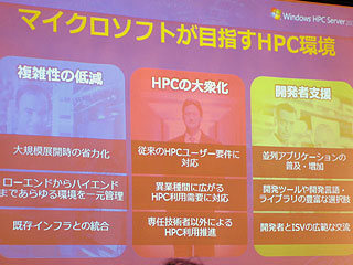 なお、マイクロソフトがHPCの新市場として金融に注目しているのは、欧米の大手金融機関が数千台から数万台のPCクラスターを導入しはじめているため。各金融機関が2−3ヵ月おきに数百台のペースで増設しているとの話もあり、ヒトゲノム解読でブームになった当時のバイオインフォマティクス市場に近い盛り上がりがあるようだ。リスクマネジメントからスタートしてさまざまな金融商品の分析などを行うが、驚くことにマイクロ秒単位で少しでも速く計算を終わらせたいというニーズがあるほどなのだという。