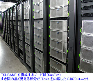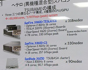TSUBAME1.2では、Teslaを4個搭載した1Uサーバー形状のS1070を170台(Teslaが680個)装備している。これにより、現在のTSUBAME1.2の全体としては、オプテロンマシンのSunFire X4600にTeslaおよびClearSpeedを接続したノードが318、SunFire X4600にClearSpeedを装着したノードが330、ジーオンマシンのSunBlade X6250ノードが90−という構成になっており、3つの異なるノードと4種類のCPU/GPUが混在する異機種混合型のスーパーコンピューティングシステムとして運用されている。