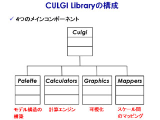 具体的な製品構成は、「CULGIライブラリー」と「CULGI GPE」の2つの部分に分かれている。ライブラリーはさらに4つのコンポーネントから構成される。メソスケールに特有のビーズ・スプリングモデルやガウス鎖モデル、全原子モデルといったモデル構造を構築するためのコンポーネント集「Palette」、メソスケール対応の計算エンジンを集めた「Calculators」、データ解析・可視化のためのアニメーション表示やグラフ表示を行う「Graphics」、異なるスケールのモデルをマッピングして連携させる「Mappers」−からなる。すべてC++のクラスライブラリーであり、直接ユーザープログラムに組み込むほか、Tcl(ティクル)やPython(パイソン)などのスクリプト言語から呼び出すことも可能。
