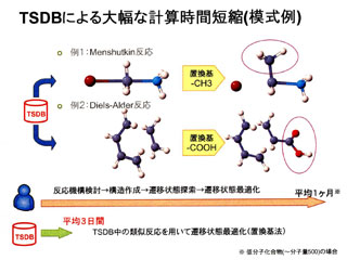 TSDBには200種類の人名反応を含む2,000件の遷移状態データ(高精度な量子化学計算結果)が登録されている。同社は、TSDBの中の類似反応を用いて対象とする系の遷移状態を最適化する“置換基法”(特許取得済み)を開発。これにより、遷移状態を探索し最適化するために通常なら1ヵ月かかる計算が、3日間に短縮できるということだ。また、2,000件のデータで、その数百倍の反応に対応できるのが特徴で、新規の反応でも幅広く評価することが可能になる。