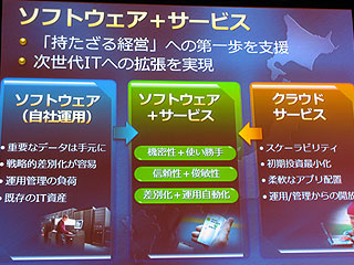 このことは、同社の企業向けビジネス戦略の今年のポイントの1つである“ソフトウエア+サービス”を前進させる重要な背景になるという。これは、社内にソフトウエアをインストールして使う通常の運用と、クラウドコンピューティングの各種サービスを組み合わせる考え方で、「いわば両者の良いとこ取りであり、エンドユーザーからは社内かクラウドかどちらを使っているのかわからないようなシームレスな統合も実現できる」。