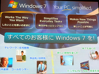 また樋口社長は、「Windows7が動作可能なスペックのPCが一般市場で1,550万台、法人市場で1,140万台稼働中。また、Windows7対応機へと買い替えが期待できるものとして、一般市場で1,980万台、法人市場で2,310万台のPCが稼働している。これらすべてがWindows7が普及するインストールベースになると考えている」とし、早期普及への自信を示した。