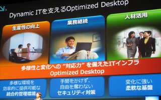 さらに、ユーザーの多様なワークスタイルを支援するという意味で、アプリケーション仮想化製品「Microsoft Application Virtualization」(略称・App-V)のデモを実施。これは、「Microsoft Desktop Optimization Pack」に含まれるツールで、アプリケーションの動作環境を仮想化してパッケージングし、それをサーバーからクライアントPC側に配信して動作させるもの。アプリケーションはPCにインストールされないため、ユーザーIDとパスワードでログインすれば、出張先の海外支店のPCでも自分が普段使っているデスクトップ環境を呼び出すことが可能。通常は共存できないExcel2007とExcel2003を同時に使用することも可能だという。