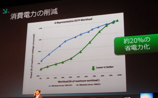 デモンストレーションでは、まずは省電力が取り上げられた。CPU負荷の低いアイドリング状態で、Windowsサーバー2003が216ワットを示したのに対し、Windowsサーバー2008 R2は157ワットにとどまった。これは、アイドル時にCPUの周波数を低く制御する技術に加え、“コアパーキング”と呼ばれる低消費電力技術を採用したため。低負荷時に使っていないコアに通電しないことで電力を低く抑えている。この過程はダイナミックにコントロールされ、処理の負荷がかかると直ちに休眠していたコアが復帰する。全体として、一般的な稼働率の範囲で約20%の省電力化につながるという。