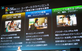 最後に登壇したのは米マイクロソフトの沼本健コーポレートバイスプレジデント(Officeプロダクトマネジメントグループ)で、Office2010をはじめとする2010シリーズについて紹介した。とくに、共同作業における生産性向上を重視し、デバイスや場所の制限なしにオフィスソフトを活用できることが示された。