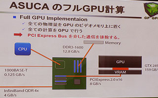 今回の青木教授らの研究では、WRFと同等の次世代気象モデルとして気象庁が開発中の「ASUCA」のプログラム全体をGPU化し、学内のスーパーコンピューター「TSUBAME1.2」に搭載されているGPUシステムで動作させた。具体的には、シングルGPUで44.3ギガFLOPS(CPUの1コアに対して約80倍の性能)、さらに120個のGPUを並列利用することで3.22テラFLOPSの実行性能を達成した。2キロメートルの格子間隔で、日本列島全土を含む「3164×3028×48」の計算格子を用いると、120GPUで実際の6時間分の気象現象が70分で解析できたことになる。