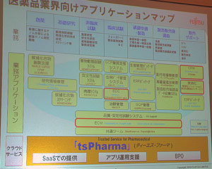 2010.08.05−富士通は4日、記者説明会を開催し、製薬業向けのソリューションコンセプトである「tsPharma」を発表、幅広い業務アプリケーションを積極的にクラウド/SaaSに対応させていく方針を明らかにした。今年1月に開始した臨床開発向けの「tsClinical」に続き、新薬申請文書管理システムを9月から、MR(医薬情報担当者)向けの営業支援システムを8月からSaaSにて提供開始する。いち早くクラウド志向を前面に押し出すことで、製薬業向け事業のさらなる拡大を図る。