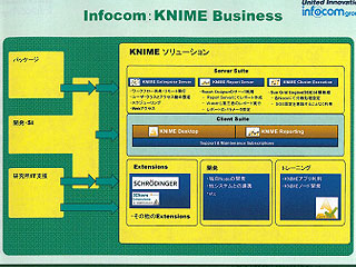 インフォコムはナイム社の公式パートナーで、2008年から無償版のサポートサービス、ノード開発やワークフロー構築の受託などを開始。今年からはエンタープライズ版の国内販売も行っている。また、自社でもKNIMEノード集を「JChem Extensions」として開発・販売しているほか、販売権を持っているシュレーディンガー社のノード集も提供中。とくに、「JChem Extensions」は2008年発売当初は26個のノードを提供しているだけだったが、現在は70個にまで拡大している。