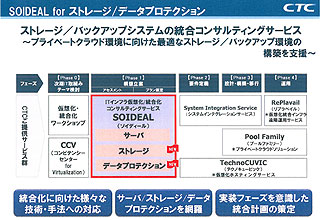 また、コンサルティングサービスの「SOIDEAL」は、プライベートクラウド環境を構築するためのサーバー仮想化・統合化のためのコンサルティングサービスとしてスタートしたものだが、今回はサーバー分野に加えてストレージおよびバックアップ環境にまでサービス領域を拡大した。これにより、プライベートクラウドにおける統合データマネジメントのインフラ構築を包括的に支援できるようになった。