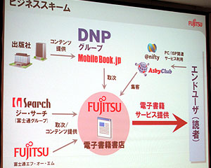 2011.03.04−富士通は3日、電子書籍ビジネスに参入すると発表した。まずは大日本印刷(DNP)と提携し、5月からサービスを立ち上げる。DNPグループが提供する数万点の電子書籍に加え、ジー・サーチなどの富士通グループのコンテンツも合わせて配信していく。いったん購入した電子書籍は、パソコンや携帯電話など複数の端末で利用できるようにするという。向こう3年間で40億円規模の売り上げを見込む。