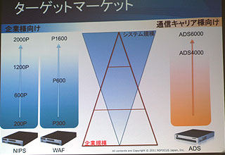具体的なアプライアンス製品としては、ウェブアプリケーションファイアウォール(WAF)の「P300/P600/P1600」(250万円から)、IPSの「NIPS200/600/1200/2000」(130万円から)があり、小規模から大規模までの企業で利用が可能。また、分散サービス妨害(DDoS)攻撃を防止する通信キャリア向けの「ADS4000/6000」(数千万円規模)もラインアップ。さらに、マルウエア感染やサイト改ざんなどの24時間対応常時監視サービス、ウェブアプリケーションやプラットホームの脆弱性検査サービスなどを提供するASPサービス「WSP」も提供している。WSPには、今春にDNSモニタリングサービスもメニューに加えるという。