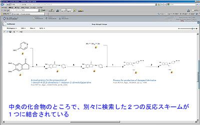 ライブラリーには、クリッピングした情報が「文献」「物質」「反応」の3つのタブにまとめられているのでわかりやすい。また、同じ化合物を含む複数の反応スキームをワークスペースにまとめる場合、自動的に同一化合物の部分が重なってスキームを1つに結合することが可能。ワークスペースに貼られた情報はただの絵ではなく、DBへのリンクを保持しているので、ワークスペース内から反応条件などの詳細情報を直接確認することもできる。ワークスペースにまとめた情報は自動的にサーバー上に保存され、印刷したり、高画質画像形式やPDF形式で保存したりすることも可能だ。