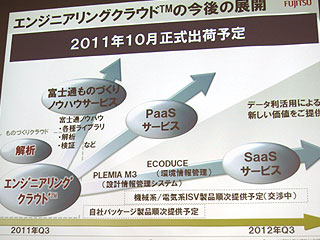 2011.06.22−富士通は21日、製造業の設計・開発業務をクラウド上で支援する次世代ものづくり環境として、「エンジニアリングクラウド」を10月から提供開始すると発表した。CADなどのアプリケーションをクラウド上で提供する「エンジニアリングクラウド/SaaS」と、ホスティングサービスを提供する「エンジニアリングクラウド/PssS」の2種類がある。エンジニアリングに特有の巨大な設計データなどを効率良く転送する独自技術を組み込んだことが最大の特徴となっている。利用料金は、月額数万〜数十万円のレンジで、3年間に100億円の売り上げを見込んでいる。