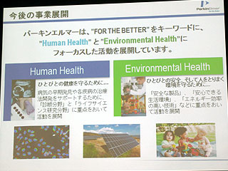 青木社長は、最新のパーキンエルマーの戦略について、「“For The Better”をキーワードに、人々の健康を守るヒューマンヘルスと、人々の安全とそれを取り巻く環境を守るエンバイロメンタルヘルスの2つの領域で事業を展開している」と説明。「食品の品質管理・安全管理、創薬・臨床試験、先天性疾患の早期発見・予防、三次元による細胞画像解析、飲料水・地下水・表層水の微量金属分析など、この分野にはさまざまなテーマがあるが、そのための機器を提供するだけではなく、顧客と一緒になってトータルソリューションをつくりあげていくことが目標になる」と述べた。