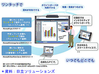 2012.02.15−日立ソリューションズは14日、離れたところにいる人同士が同じ場所にいるような感覚で会議ができる次世代コラボレーションシステム「Hitachi Advanced Collaboration System」を開発し、日本および欧米市場で3月1日から発売すると発表した。音声・映像の使用や資料の共有と書き込み、ホワイトボードの活用など、高度な電子会議の機能を実現すると同時に、相手がどこにいても複雑な手順なしにすぐに会議を開始できる気軽さが特徴。複数拠点に分かれた開発チームのメンバーが図面などの技術情報を含めたやり取りを行うなど、製造業の分野で高い効果が見込まれるという。同社では2015年度に世界で20億円、2017年度には50億円の売り上げを計画。この市場で世界リーダーになることを目指していく。