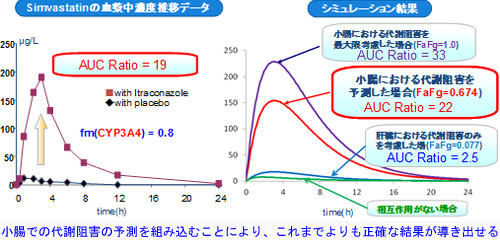 また、薬物の代謝は肝臓と小腸で行われるが、これまでは小腸での代謝阻害を最大に考慮して補正するか、肝臓だけの代謝阻害で解析するかの両極端の選択肢しかなかった。今回は、小腸での代謝阻害を予測する機能が組み込まれており、より正確な薬物間相互作用予測ができるようになっている。(別図参照)