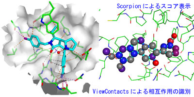 一方の「Scorpion」は、「ViewContacts」の計算結果をもとにネットワークモデルに基づくスコア関数を生成し、そのスコアをベースにしてより安定的な複合体構造を調べることができる。実際のたん白質とリガンドとの相互作用は、リガンド分子のある置換基が最も強く相互作用しているアミノ酸残基との1対1の単純な関係ではなく、そのアミノ酸残基が別のアミノ酸残基とも相互作用していたり、同じアミノ酸残基がリガンドの別の置換基とも相互作用していたり、複数のアミノ酸残基が同じ置換基と相互作用していたりする場合が多いといわれる。