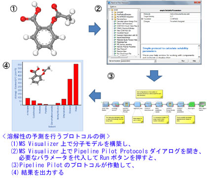 これまでも、パイプラインパイロットのプロトコルにマテリアルスタジオの機能を組み込むことはできたが、今回はマテリアルスタジオの中からパイプラインパイロットを呼び出すことができるようになった。これにより、マテリアルスタジオで材料設計を行いながら、必要に応じてパイプラインパイロットのプロトコルを使用して解析手順を自動化して実施し、その結果をマテリアルスタジオに戻して設計を続けることが可能。研究者の思考を中断させることなく、スムーズな流れで研究を進めることができる。