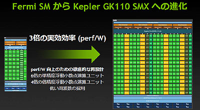 前世代の“Fermi”に使われていたSM(ストリーミングマルチプロセッサー)は32コアだったが、倍精度演算時は2コアを使用するため、実質16コアでの動作となっていた。これに対して、今回のKepler SMXは倍精度演算器を独立させており、192コアのうちの64コアが倍精度専用。ただし、SMXは消費電力を抑えるために動作周波数をSMの半分に落としている。つまり、倍精度演算時、SMXはSMの4倍のコアが働くことになるが、性能としてはSMの2倍ということになる。