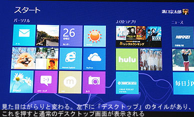 デスクトップもそのタイルの1枚になっており、それをクリックすれば通常のデスクトップ画面が表示される。「チャーム」の「スタート」でいつでももとのスタート画面に戻ることができる。