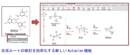 Reaxysはもともと反応情報が豊富であるため、合成法の検討に使われることも多く、そのための“合成計画(Synthesis Planning)”機能が搭載されている。これは、合成したい化合物の前駆体を逆合成的に検索することで合成経路を図示できる機能。これまではマニュアル操作で経路を組み立てたが、今回の機能強化で複数の逆合成経路を自動的に作成する“Autoplan”機能が実装された。複数の経路を同時に表示して比較したり、全体をみながらマニュアルで情報を追加したりすることによって、オリジナルの経路を検討することも容易に行える。