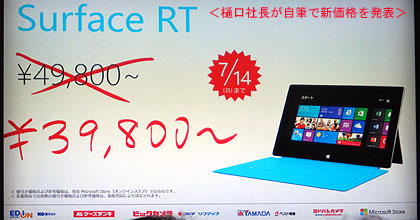 2013.06.13−日本マイクロソフトは13日、タブレット端末「Surface RT」をきょう14日から値下げすると発表した。記憶容量が32GBのモデルが3万9,800円、64GBは4万7,800円と、それぞれ1万円引き下げた。東京・品川の本社で緊急会見した樋口泰行社長はアップルのiPadへの対抗意識をあらわにし、「向こうが(円安で)値上げするならこっちは下げてやろうと。これをチャンスととらえ、米国本社とも相談して緊急に決断した」と述べた。アップル製品と比較して、3,000円から最大2万2,000円の価格差が出る。