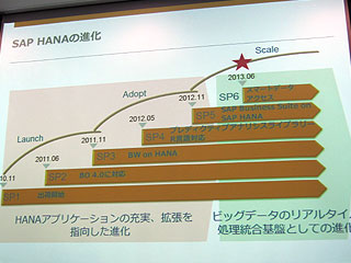 SAP HANAは、ハードウエアと一体化してアプライアンスとして提供されている製品で、2010年11月に登場して以来、およそ半年ごとにサービスパックというかたちで機能強化されてきた。これまでは主に新世代型のデータウェアハウス(DWH)システムとして普及しており、大量データをインメモリーで扱う特徴を生かして、予測分析の機能を統合。直近では、ERP(エンタープライズリソースプランニング)との連携も可能になり、経営データをインメモリーで解析するユーザー事例もあらわれてきている。