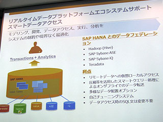 さて、今回のSP6だが、同社ではこれまでがHANAの応用範囲を広げてきた段階、これからはHANAをビッグデータのリアルタイム処理統合基盤として発展させる段階と位置づけている。とくに、新しいスマートデータアクセス機能は、HadoopやSAP Sybase Adaptive Server(SAP Sybase ASE)、SAP Sybase IQ、その他のサードパーティー製DWH(まずはTeradataをサポート)など、異種のデータが混在するリレーショナルおよび非リレーショナル型のデータベースに対して動的なクエリーを実現する。