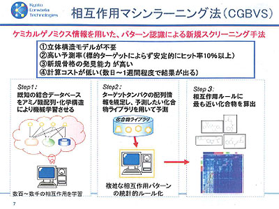 「化合物のインシリコスクリーニングの新しい手法だ。受容体の構造が既知の場合にリガンドの結合性を評価(ドッキングシミュレーション)するストラクチャーベース、受容体が未知の場合にリガンド構造の類似性などを指標に探索するリガンドベースという二大手法に対し、たん白質と薬物との相互作用データを用いるケミカルゲノミクスベースの手法がCGBVSだ。アミノ酸配列情報と化学構造情報をもとにした相互作用データを機械学習させ、複雑な相互作用パターンを統計的にルール化する。そのルールに基づいて調べたいたん白質と薬物の相互作用を予測しスクリーニングを行う。たん白質の立体構造が未知でも適用でき、いままで気づかなかった相互作用が判明したり、新規の骨格構造の発見につながったりするなどのメリットがある。これまでの受託解析の実施例として、GPCRで15件、イオンチャンネルで9件などのほか、キナーゼや酵素系などで多くの実績がある」