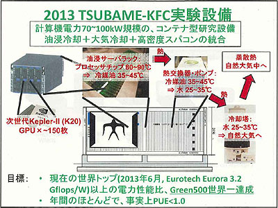 とくに、「TSUBAME3.0」ではウルトラグリーン化を目指しており、大幅な省電力化を達成する計画。性能電力比で2006年に開発した「TSUBAME1.0」の1,000倍を実現させる。その1つとして、冷却電力を削減するため、今回の「TSUBAME2.5」に合わせて、新しい油浸冷却技術を評価するための実験設備を導入した。夏場以外は、冷却電気代がほぼゼロになると期待されるという。