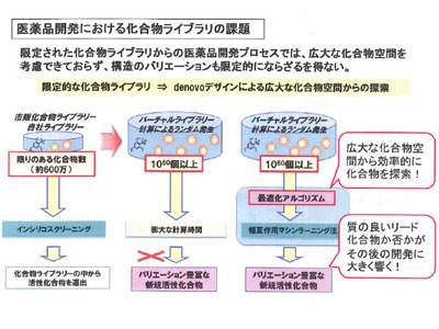 通常のスクリーニングでは、多い場合で数百万件の化合物ライブラリーから有望な化合物を絞り込んでいくが、化学構造のバリエーション自体は10の60乗以上の数があるといわれているという。この広大な空間を漏らさず探索しようというのが、「CzeekD」の最終的な目標となる。