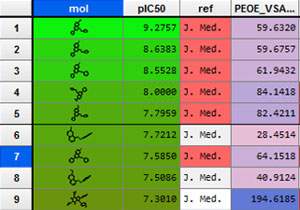 「MOE 2013.08」はこれら以外にも多くの機能強化が実施されているが、細かなところではデータベース(DB)ビューアーがさらに便利になったことがあげられる。MOEには65万件のリードライク化合物DB、ChEMBLから作成した83万件の分子フラグメントDBのほか、8万件以上の全PDB構造データ、抗体DB、キナーゼDB、GPCR DBなど豊富なコンテンツが搭載されている。それら大量のデータをスプレッドシートのイメージで高速に扱うことが可能。新しいビューアーでは、データフィールドを色付けしてわかりやすく表示できるようになった。数値のレンジや境界値、他のフィールドとの連動など、さまざまな設定で色分けすることができるため、ポイントが一目でわかるという。