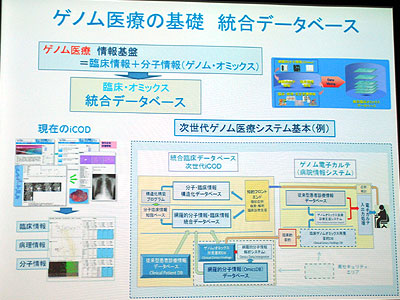 加えて、東京医科歯科大学との共同研究により、個別化医療に向けたデータ解析基盤の構築にも取り組んでいる。現在、疾患の発症には遺伝的な要因と環境生活的な要因の両方が影響し合っていると考えられており、個別化医療・個別化予防を実現するためには、個人の遺伝情報(ゲノム、たん白質、転写、代謝物など)と環境情報食生活、運動習慣、飲酒、喫煙など)を大量に集積する必要がある。米国ではすでに先進的な医療機関が遺伝情報を利用した医療を実施しているほか、英国でも50万人の医療情報を追跡してデータベース化するバイオバンク構想が進行しているという。